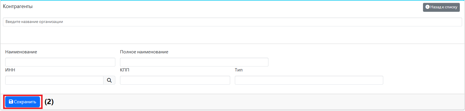 При введении названия контрагента Вам будут предложены позсказки, в виде спадающего списка. Заполните форму и нажмите кнопку "Сохранить"(2).