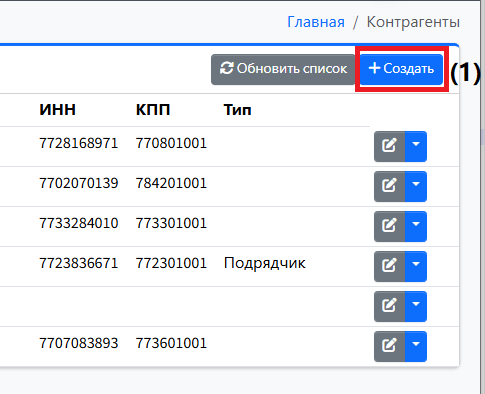 Для добавления контрагента нажмите кнопку "Создать"(1).
