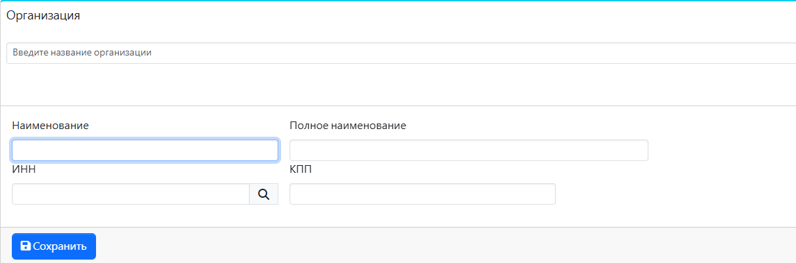 Введите наименование, Полное наименование, ИНН и КПП. Нажмите кнопку "Сохранить".
