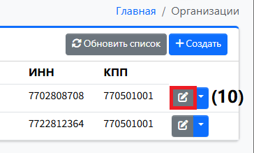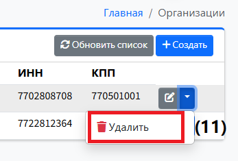 Для удаления организации нажмите кнопку "Удалить" (11).