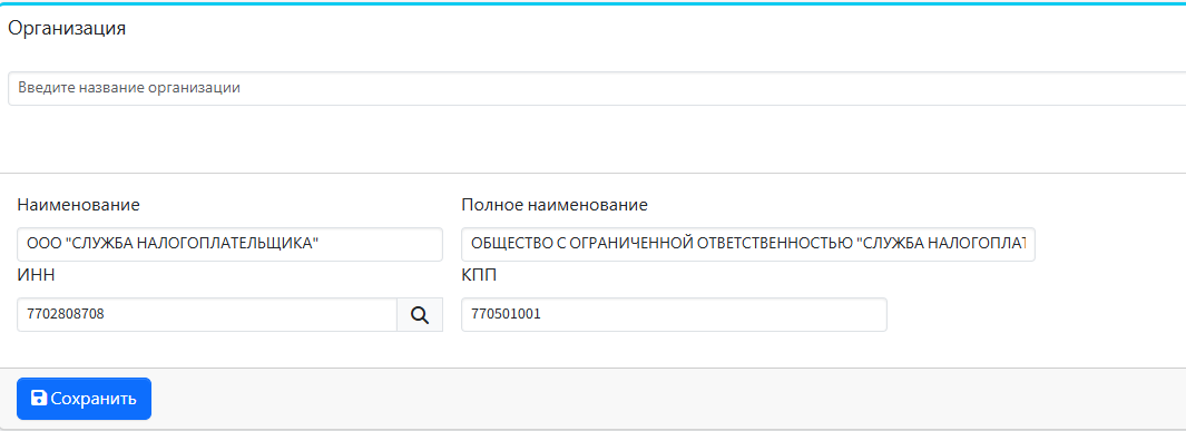 Важно: Вы можете использовать поле поиска организаций. Программа выдаст Вам спадающий список подходящих организаций. При нажатии на нужную организацию заполнятся все поля формы создания организации.