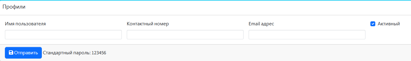 Введите имя пользователя, контактный номер, Email адрес и поставьте галочку "Активно". Нажмите кнопку "Сохранить".