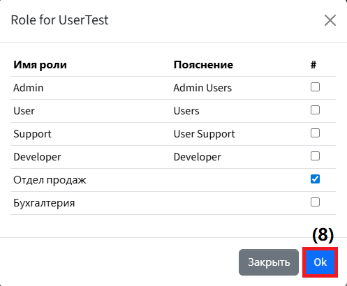 Поставте галочку напротив нужных ролей пользователя. После нажмите кнопку "Ок" (8).