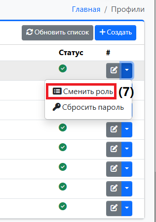 Для изменения ролей пользователя нажмите кнопку "Сменить роль" (7).
