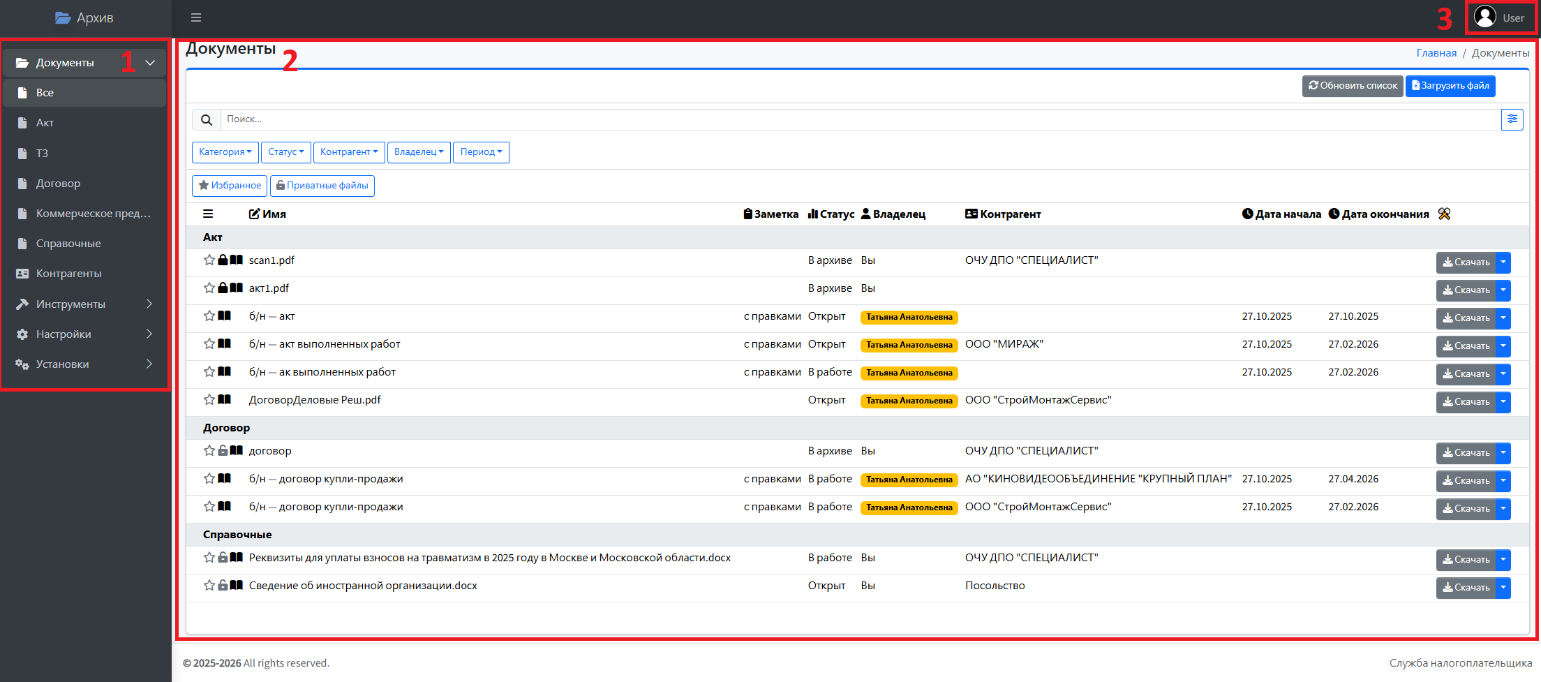 Меню навигации (1) — расположено слева и предназначено для выбора нужного раздела Архива. Содержит следующие разделы: